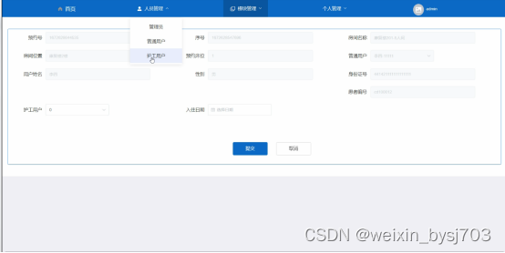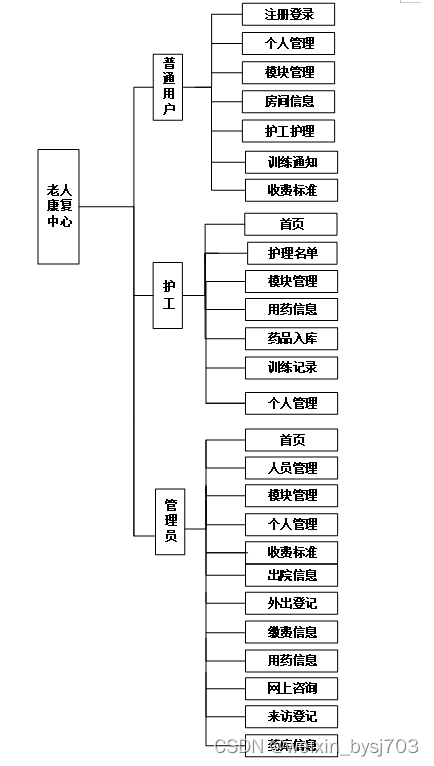 3、功能的完善性:可以管理首页、人员管理(管理员、系统用户、护工用户)、模块管理(房间信息,房间预约,入住信息,训练记录,药库信息,药品入库,用药信息,训练通知,来访登记,网上咨询,缴费信息,外出登记,出院信息,收费标准)、个人管理模块的修改和维护操作。