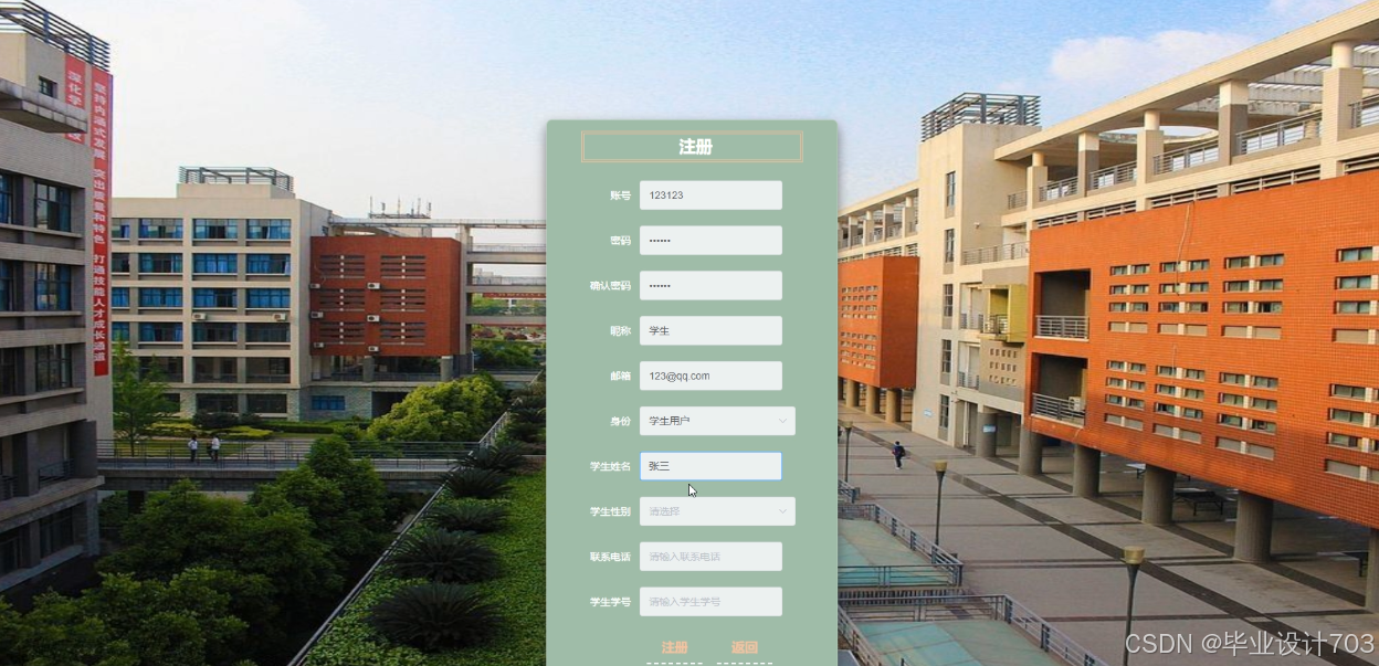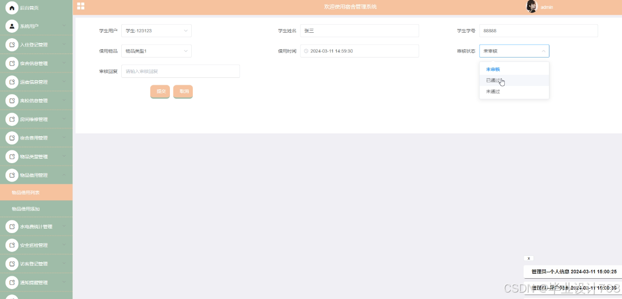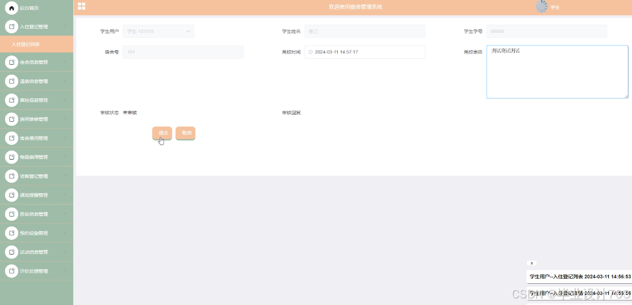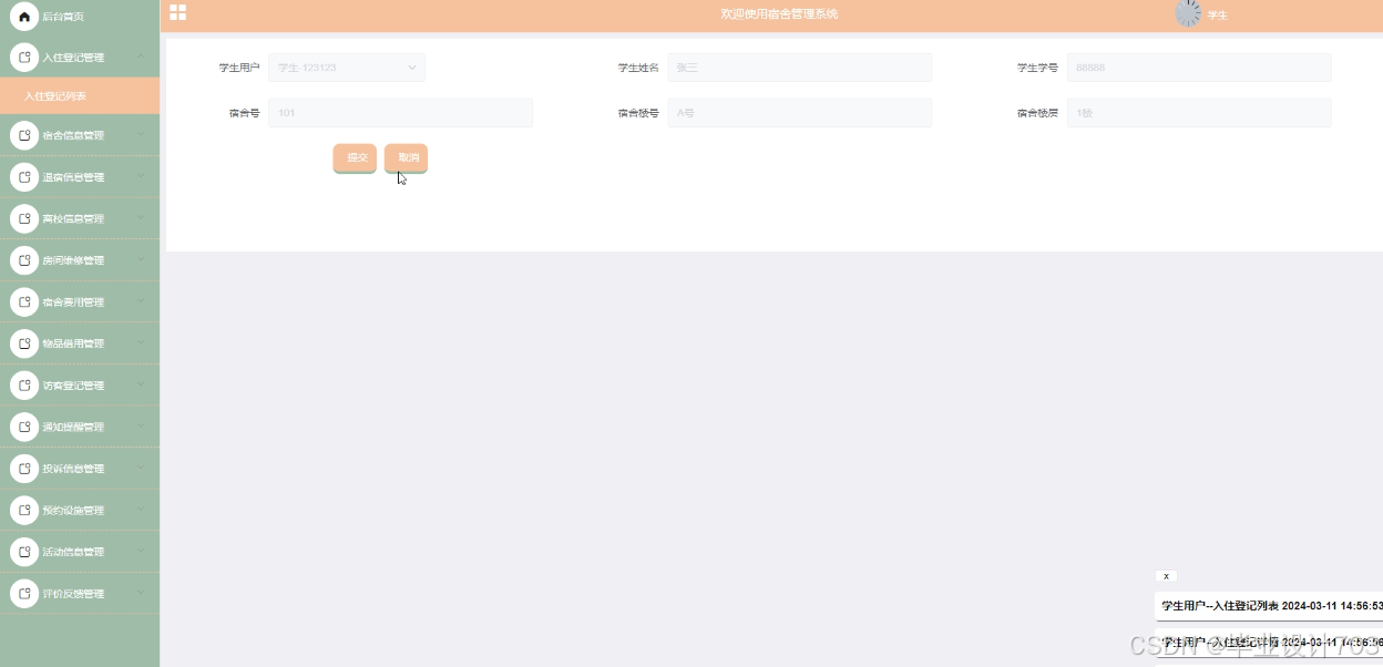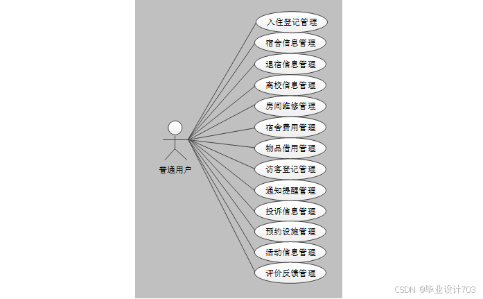 The main users of the dormitory management system are divided into administrators and student users, and the functions include backend administrators: system users, check-in registration management, dormitory information management, check-out information management, departure information management, room maintenance management, dormitory cost management, item type management, item borrowing management, water and electricity cost statistics management, safety inspection management, visitor registration management, notification and reminder management, check-in registration management Appointment facility management, activity information management, evaluation feedback management; Student users: check-in registration management, dormitory information management, check-out information management, departure information management, room maintenance management, dormitory cost management, item borrowing management, visitor registration management, notification reminder management, check-in registration management, reservation facility management, activity information management, health information management, evaluation feedback management, and other functions. Due to the comprehensive design of the functional modules on this website, the entire process of information management in the dormitory management system can be realized.