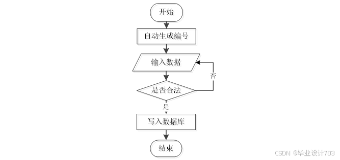 用户成功登入系统后就能够实现增加数据的操作,增加数据的编号是特定的,系统生成,用户不能随意填写,除了编号以外,其他增加信息用户自己填写,填写后的信息经过系统验证,验证合法通过就显示增加数据成功了,相反的话,就没有增加成功,图2-3显示的就是在增加数据时的流程。