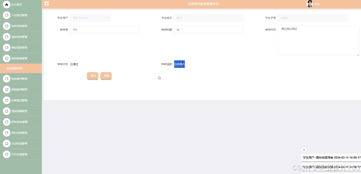 房间维修管理模块:管理员对用户的房间维修信息进行审核处理,学生用户可以查看管理员回复的房间维修处理信息。学生用户房间维修管理界面如下图所示。