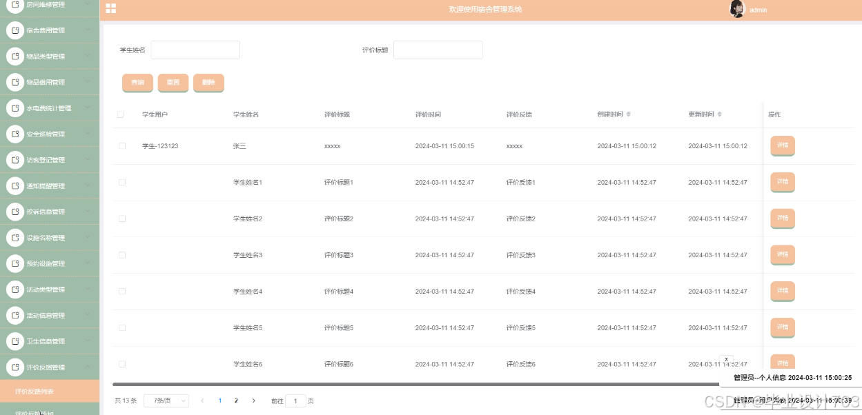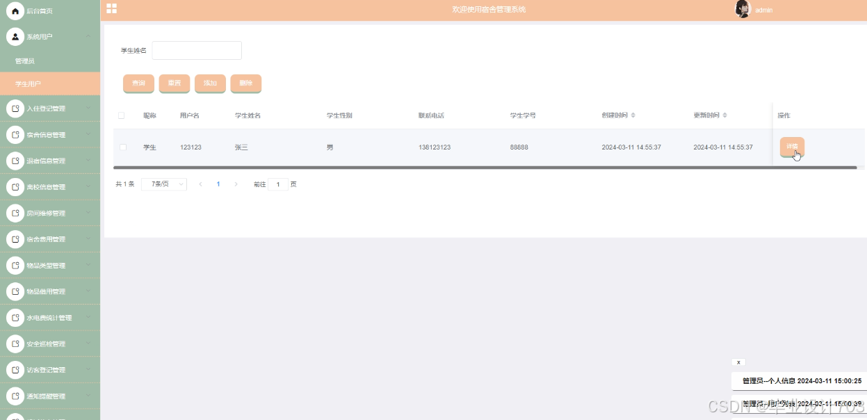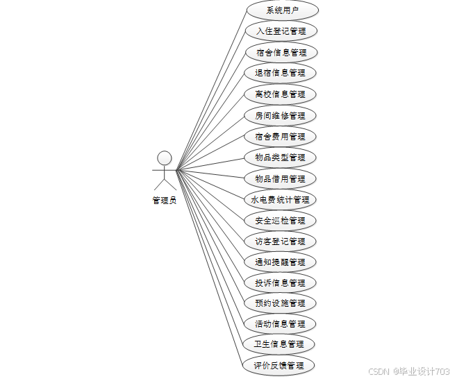 管理员进入系统后主要实现对学生用户的账户信息管理,和投入住登记管理、宿舍信息管理、退宿信息管理、离校信息管理、房间维修管理、宿舍费用管理、物品类型管理、物品借用管理、水电费统计管理、安全巡检管理、访客登记管理、通知提醒管理、入住登记管理、预约设施管理、活动信息管理、卫生信息管理、评价反馈管理等主要模块的信息处理工作。