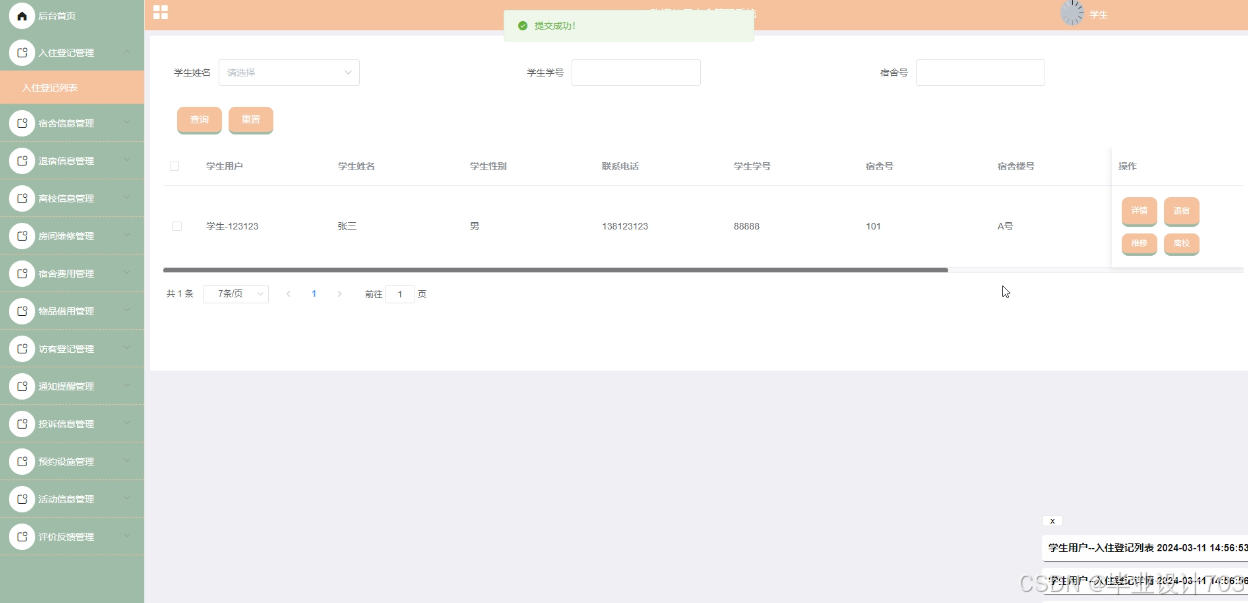 入住登记管理:管理员和学生用户都可以对入住登记进行管理,点击“入住登记管理”进入到入住登记列表界面,可以查看详情和退宿、维修、离校等信息的申请提交。以用户为例,入住登记管理界面如下图所示。