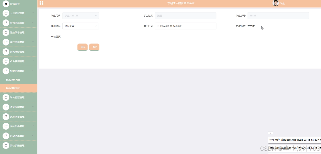 物品借用管理模块:学生用户可以提交物品借用信息,管理员进行审核。学生用户物品借用提交界面如下图所示。