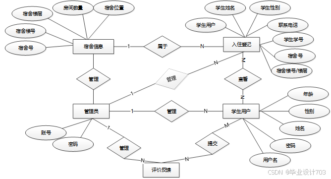 下面是整个宿舍管理系统中主要的数据库表总E-R实体关系图。