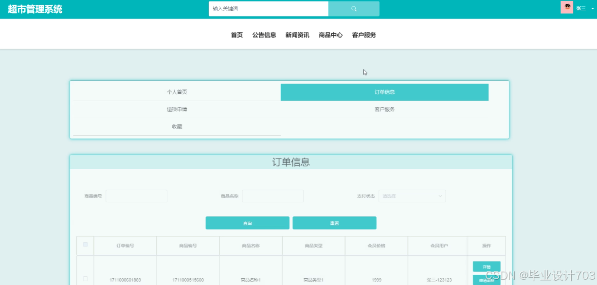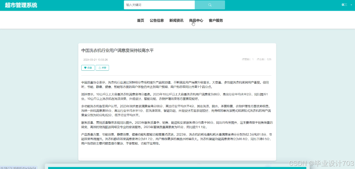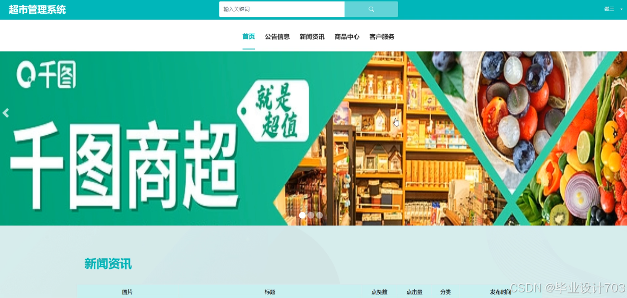 (2)查看超市管理系统的首页信息:超市管理系统的首页信息包含了首页、公告信息、新闻资讯、商品中心、客户服务等。