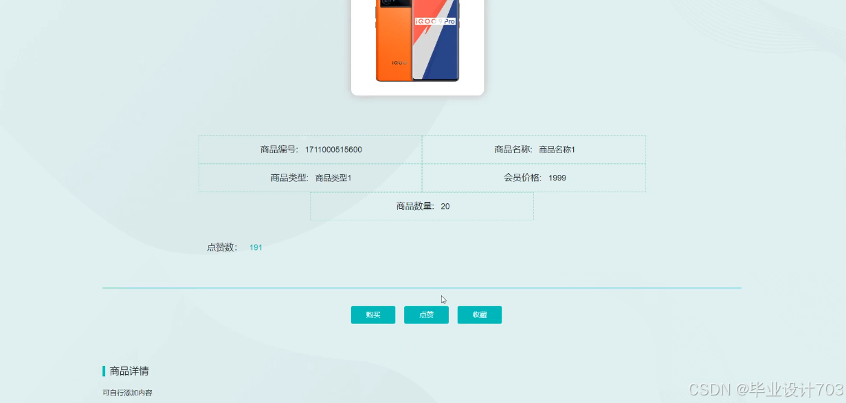 当访客在商品中心列表点击任意商品中心后将会进入该商品中心的详情界面,可以了解到该商品中心的商品编号、商品名称、商品类型、会员价格、商品数量、商品详情等,同时可以对该商品中心进行购买下单、点赞、收藏、评论,商品中心展示页面如下图所示。