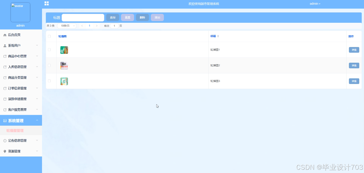 超市管理系统平台中的管理人员在“系统管理”这一菜单下是可以对超市管理系统内的轮播图进行添加修改的,其管理界面如下图所示。