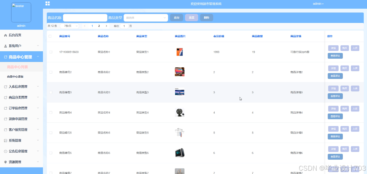 超市管理系统平台中的管理人员是可以对超市管理系统内的不同项目分类下的商品中心进行维护和管理的,支持查看到各个商品中心的评论情况以及添加+删除商品中心。商品中心管理界面如下图所示。