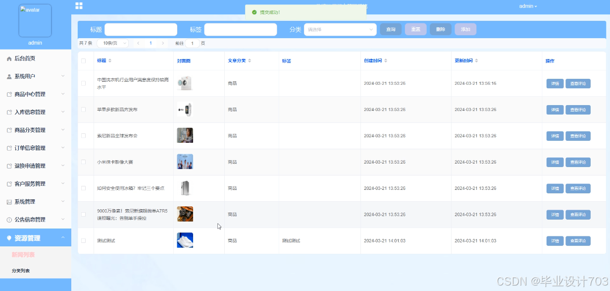 (11)资源管理:管理员可以对超市管理系统前台展示的新闻资讯以及新闻资讯所属的分类进行管控。