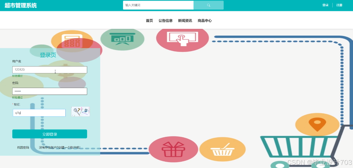 超市管理系统平台中的前台上注册后的用户是可以通过自己的账户名和密码进行登录的,当会员输入完整的自己的账户名和密码信息并点击“登录”按钮后,将会首先验证输入的有没有空数据,再次验证输入的账户名+密码和数据库中当前保存的用户信息是否一致,只有在一致后将会登录成功并自动跳转到超市管理系统的首页中;否则将会提示相应错误信息,用户登录界面如下图4-3所示。