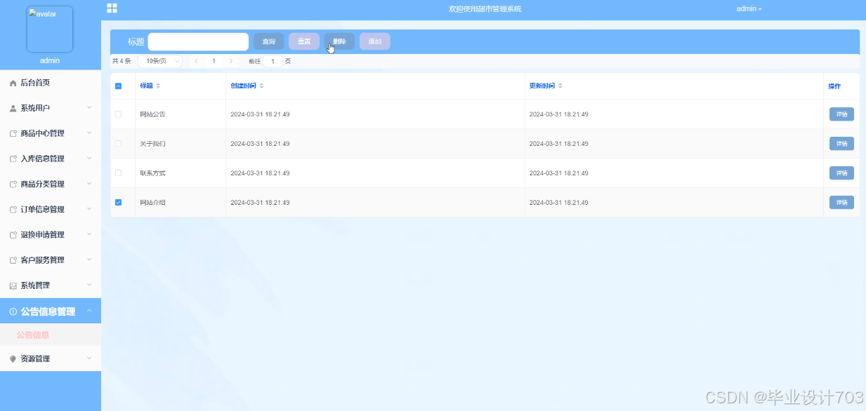 (10)公告信息管理:管理员点击“公告信息管理”菜单可以查看到系统中的所有公告信息信息,对已经存在的公告信息,管理员可以修改,也可以添加新的公告信息或者删除公告信息。