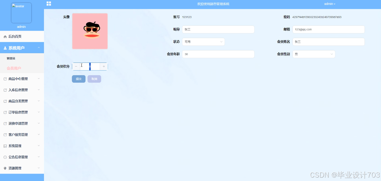 (2)系统用户:管理员可以对超市管理系统平台中的管理员和普通用户进行增删改查。