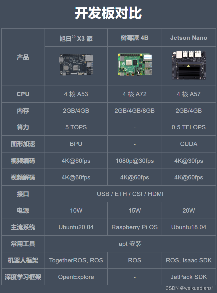 浅析了一下与当前两款比较普遍的开发板(树莓派4B、jetson nano)参数对比,如下图