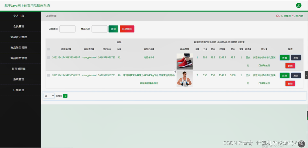 管理员点击订单管理,在已支付订单页面可以对订单编号、商品表名、用户id、商品id、商品名称、商品图片、购买数量、价格/积分、折扣价格、总价格/总积分、折扣总价格、支付类型、状态、地址等内容进行详情、发货或删除操作,还可对未支付订单、已取消订单、已退款订单、已完成订单、已发货订单进行相对应操作,如图5-14所示。