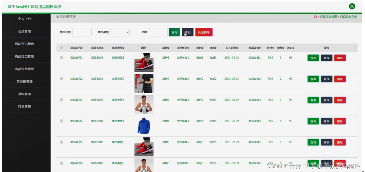 管理员点击商品信息管理。进入商品信息页面输入商品名称、品牌和选择商品类型可以查询、添加或批量删除商品详细信息,并进行查看,修改或删除操作。如图5-11所示: