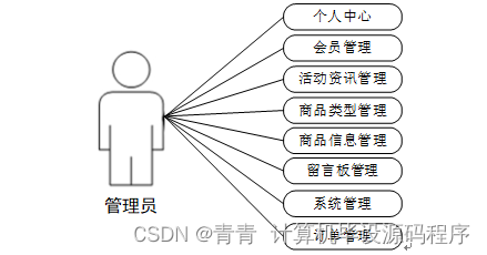 管理员登陆后,主要包括个人中心、会员管理、活动资讯管理、商品类型管理、商品信息管理、留言板管理、系统管理、订单管理等功能。管理员用例图如图3-1所示。