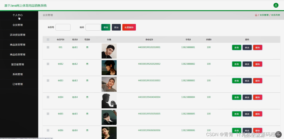 管理员点击会员管理。进入会员页面输入会员号和姓名可以查询、添加或批量删除用户详细信息,并进行查看,修改或删除操作。如图5-8所示: