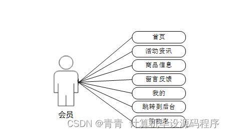 会员登陆进入系统可以实现首页、活动资讯、商品信息、留言反馈、我的、跳转到后台、购物车等功能。会员用例图如图3-2所示。