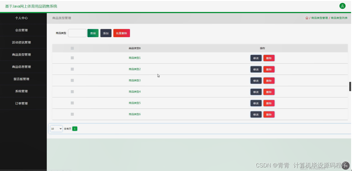 管理员点击商品类型管理。进入商品类型页面输入商品类型信息可以查询、添加或批量删除商品类型详细信息,并进行修改或删除操作。如图5-10所示: