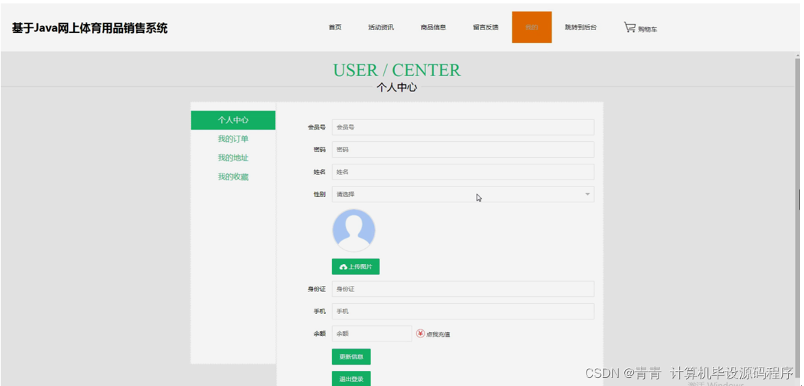 我的:在个人中心页面输入个人信息可以进行更新操作,还可以根据需要对我的订单、我的地址和我的收藏进行详细操作;如图5-5所示: