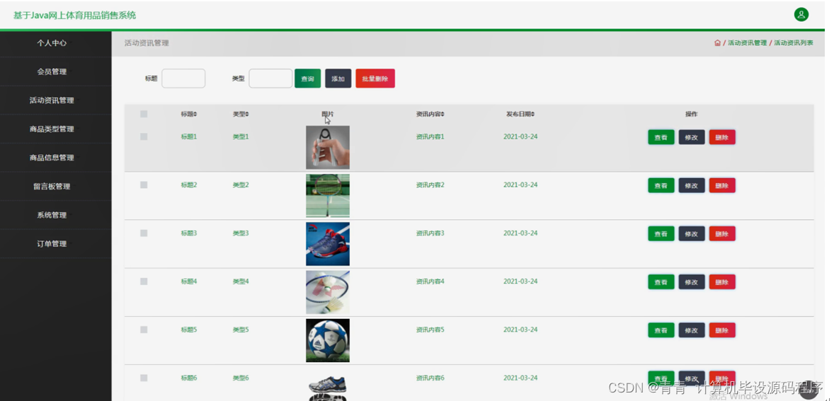 管理员点击活动资讯管理。进入活动资讯页面输入标题和类型可以查询、添加或批量删除活动资讯详细信息,并进行查看,修改或删除操作。如图5-9所示:
