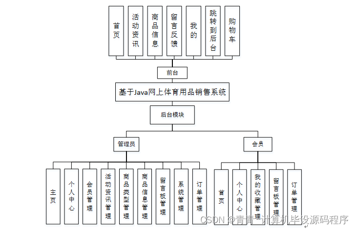 为了更好的去理清本系统整体思路,对该系统以结构图的形式表达出来,设计实现该网上体育用品销售系统的功能结构图如下所示: