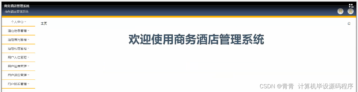 用户登录进入商务酒店管理系统可以查看个人中心,酒店信息管理,酒店房间管理,酒店预订管理,用户入住管理,用户退房管理,用户评价管理,用户投诉管理等内容进行详细操作,如图5-11所示。