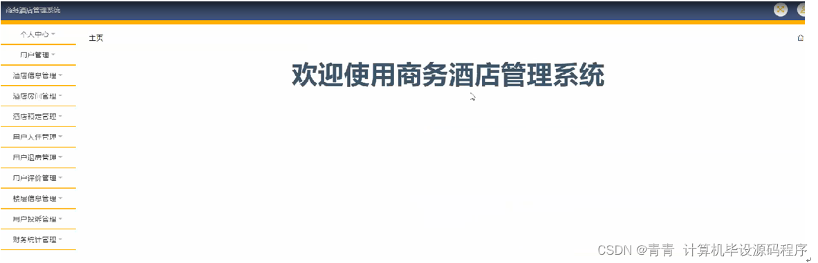模块包括个人中心,用户管理,酒店信息管理,酒店房间管理,酒店预订管理,用户入住管理,用户退房管理,用户评价管理,楼层信息管理,用户投诉管理,财务统计管理等进行相应的操作。