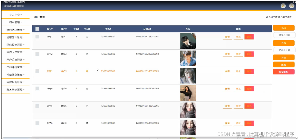 用户管理,在用户管理页面可以对账号,姓名,年龄,性别,手机,身份证,图片等内容进行查看,修改和删除等操作,如图5-3所示。