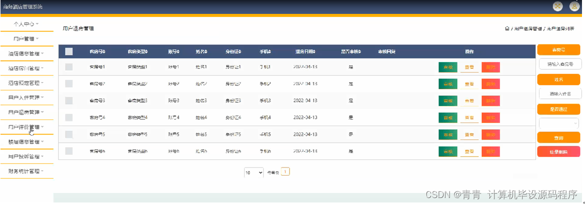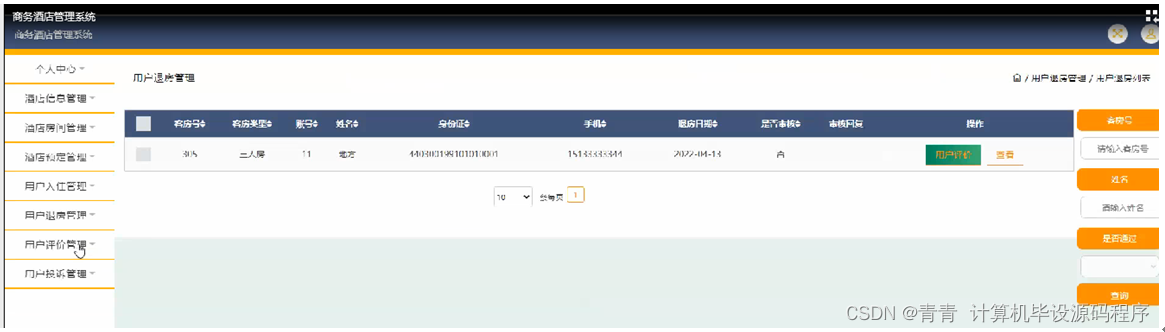 用户退房管理,在用户退房管理页面可以对客房号,客房类型,账号,姓名,身份证,手机,退房日期,是否审核,审核回复等内容进行查看,用户评价等操作,如图5-13所示。