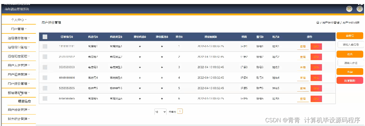 用户评价管理,在用户评价管理页面可以对 订单编号,客房号,客房类型,评价客房,评价服务,评分,评价时间,评语,账号,姓名等内容进行查看,删除等操作,如图5-9所示。