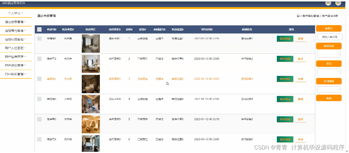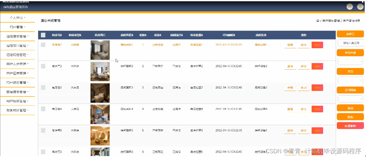 酒店房间管理,在酒店房间管理页面可以对客房号,客房类型,客房图片,房间面积,价格,状态,房间清洁,客房位置,可约时间等内容进行查看,修改和删除等操作,如图5-5所示。