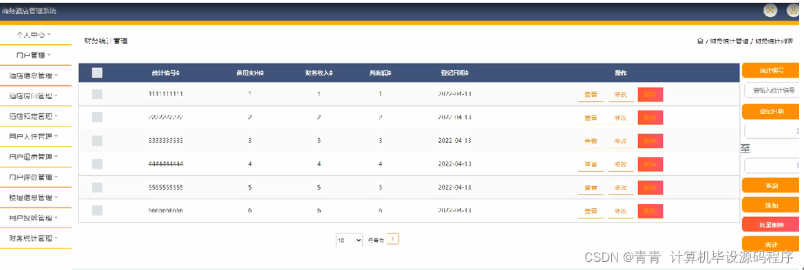 财务统计管理,在财务统计管理页面可以对统计编号,费用支付,财务收入,纯利润,登记日期等内容进行查看,修改和删除等操作,如图5-10所示。