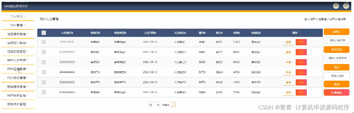用户入住管理,在用户入住管理页面可以对入住编号,客房号,客房类型,入住日期,入住备注,账号,姓名,手机,身份证等内容进行查看,删除等操作,如图5-7所示。