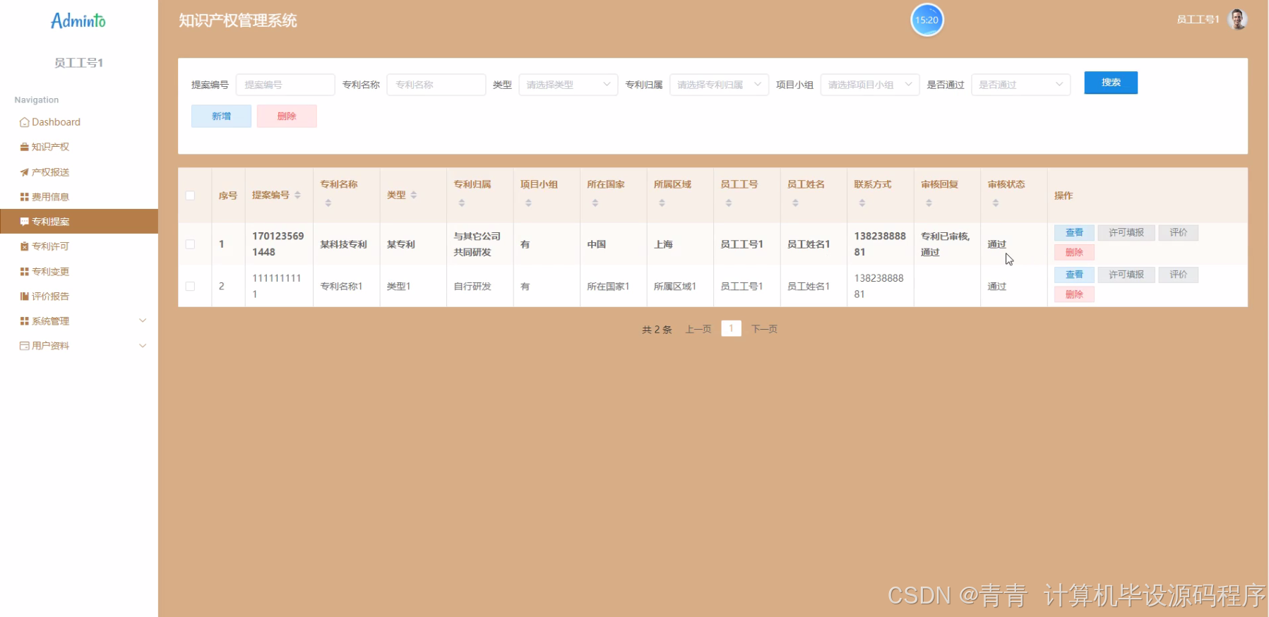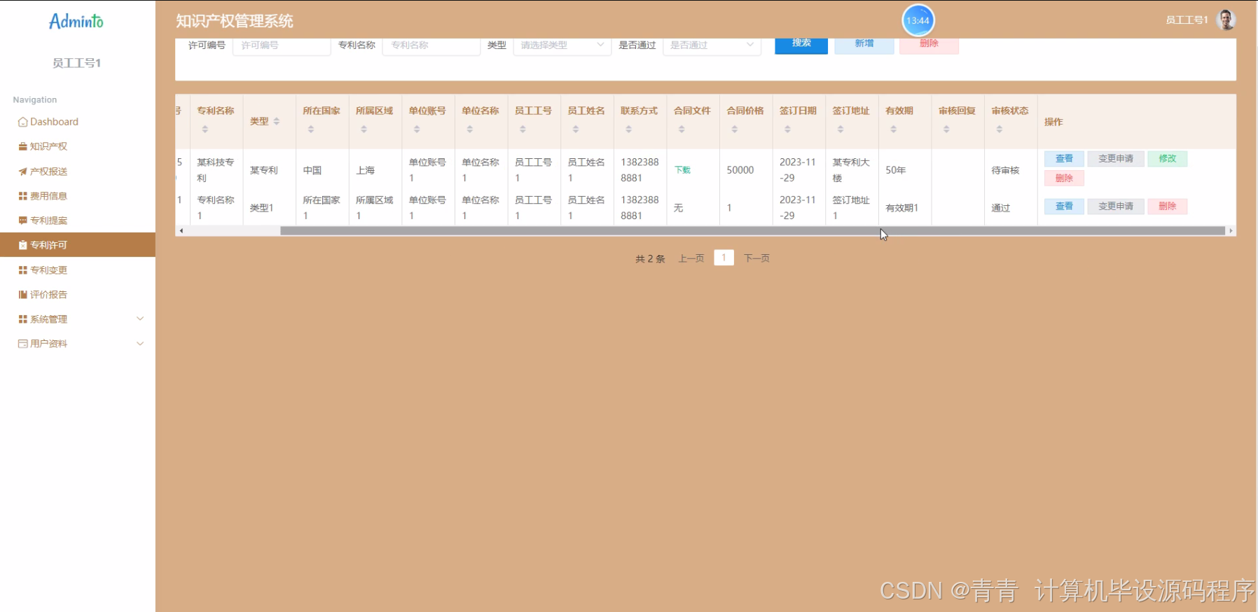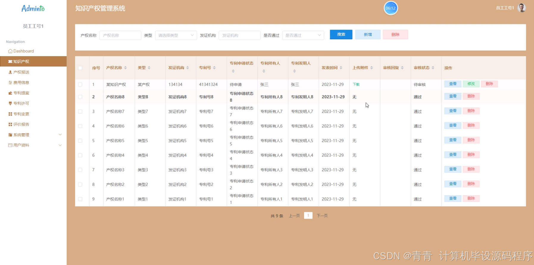 - 系统原型:成功开发出一个基于python的知识产权管理系统原型,具备职员、专利产权、知识产权、费用信息、专利提案、专利许可、专利变更、评价报告等功能模块,能够实现基本的知识产权管理业务流程。