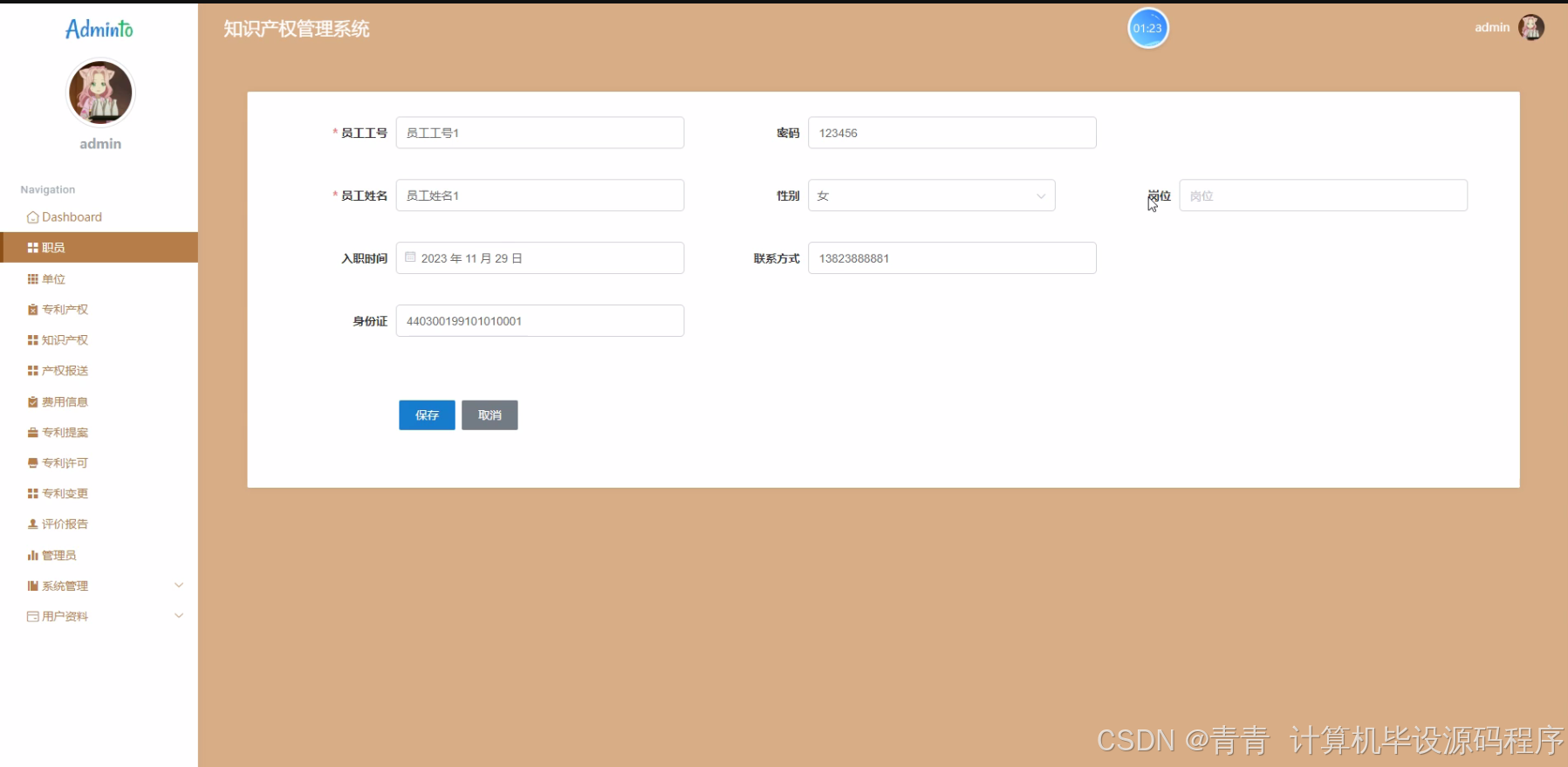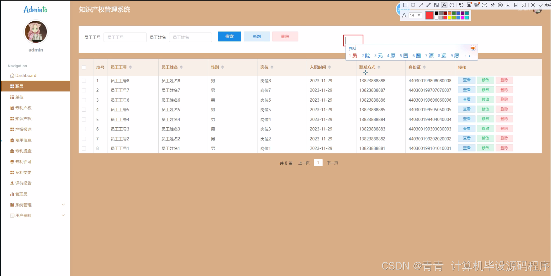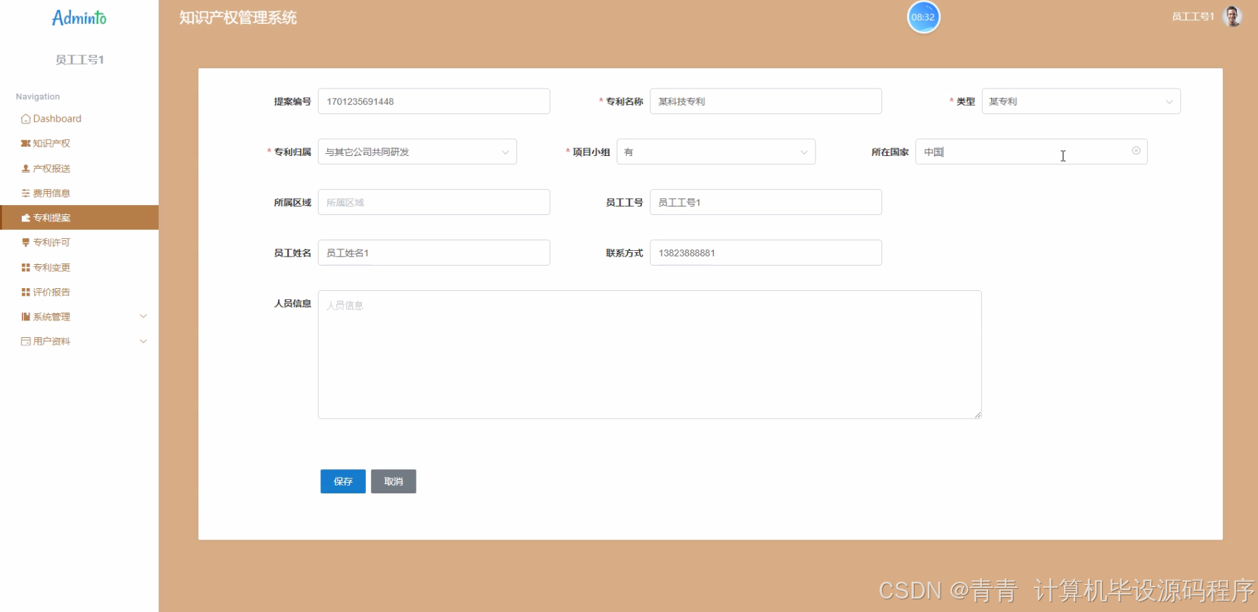 - 职员模块:管理与知识产权相关的职员信息,包括基本信息、职位、所属部门等,并且建立职员与知识产权相关操作(如专利提案、专利维护等)的关联,明确各职员在知识产权管理中的角色和权限。