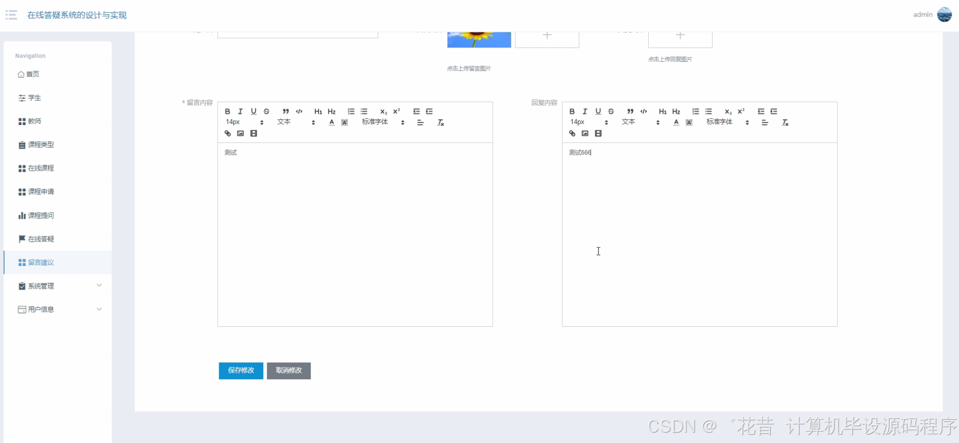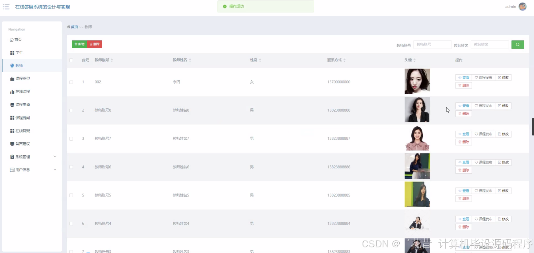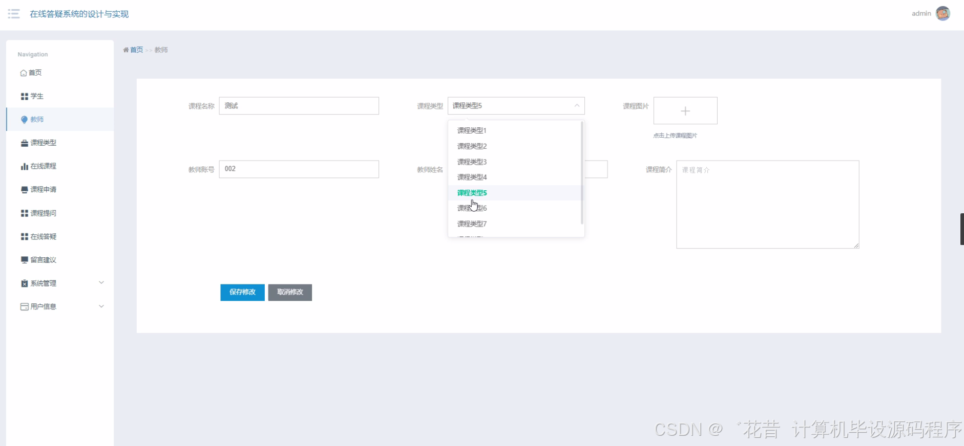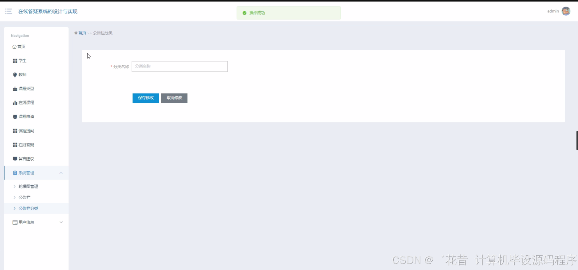 - 课程管理:包括课程类型的分类与定义,如按照毕设的专业方向、难度等级等进行分类。在线课程的发布、更新和删除等功能,确保课程资源的有效性和及时性。