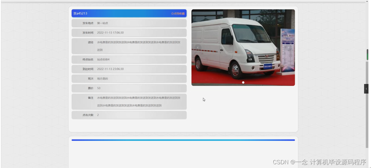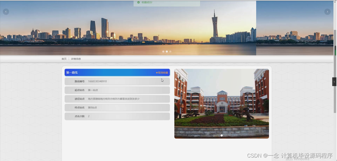 在车次信息页面的输入栏中输入公交车号、途经、选择发车地点和选择终点站名进行查询,可以查看车次信息详细信息,并进行收藏操作;车次信息页面如图5-5所示: