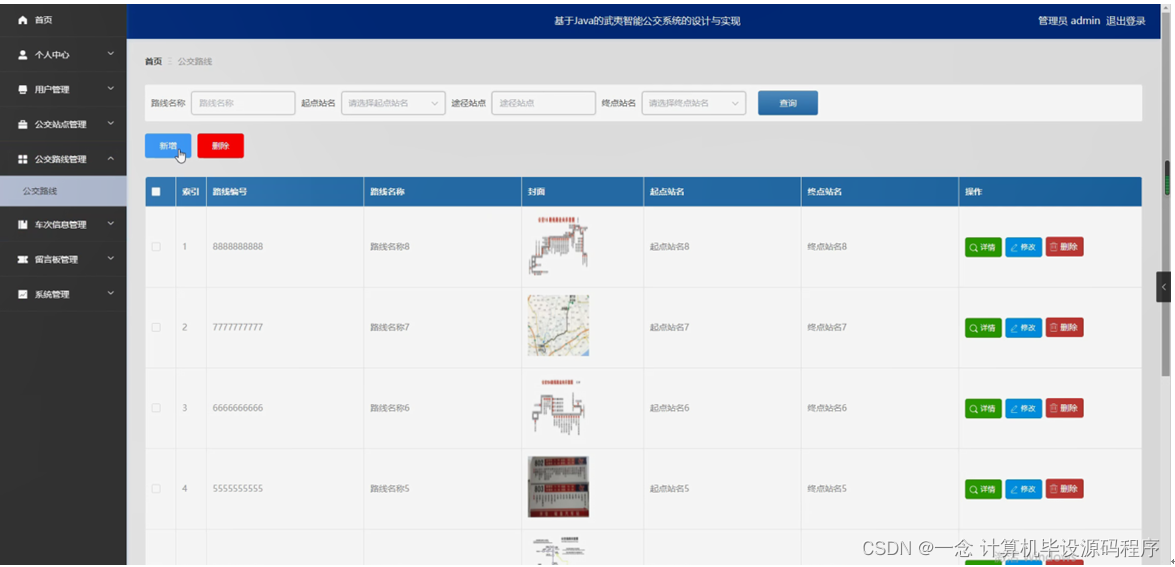 管理员点击公交路线管理。进入公交路线页面输入路线名称、途径站点、选择起点站点和选择终点站名可以查询、新增或删除公交路线详细信息,并进行查看详情,修改或删除操作。如图5-11所示: