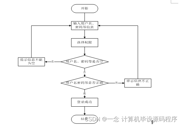 登录流程实现了管理员和用户的登录,在登录页面需要用户填写自己的信息,前端页面会将信息传递给后端接口,然后查询数据库确定该身份有效后登录成功,否则此用户登录失败,需要重新填写信息,进行再次验证,如图3-1所示。