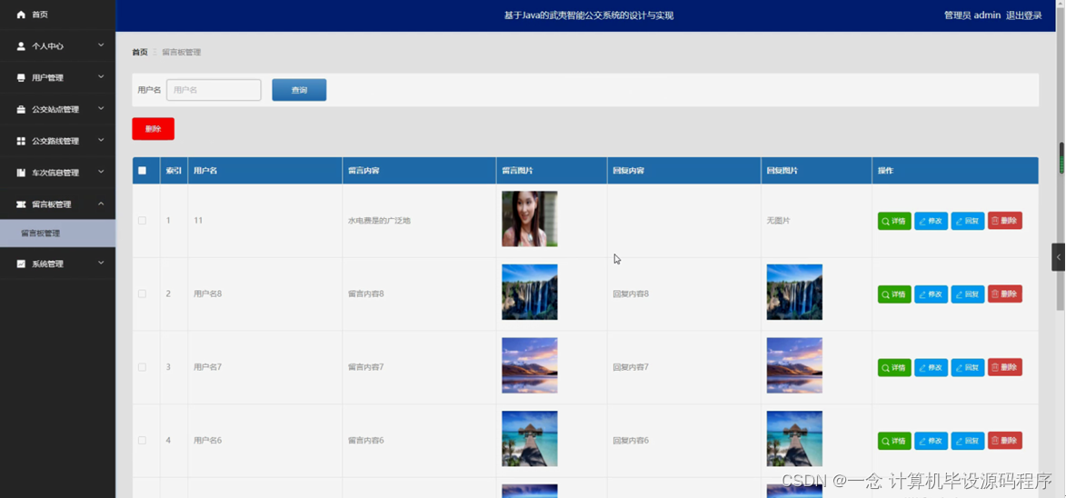 管理员点击留言板。进入留言板页面输入用户名可以查询或删除留言板详细信息,并进行详情,修改,回复或删除操作。如图5-13所示: