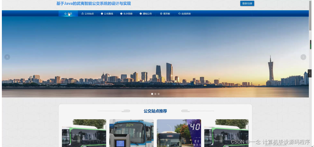 当人们打开系统的网址后,首先看到的就是首页界面。在这里,人们能够看到武夷智能公交系统的导航条和公交站点推荐信息等。系统首页界面如图5-1所示:
