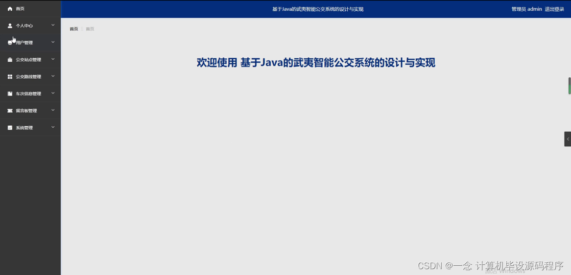 管理员进入主页面,主要功能包括对首页、个人中心、用户管理、公交站点管理、公交路线管理、车次信息管理、留言板管理、系统管理等进行操作。管理员主页面如图5-8所示: