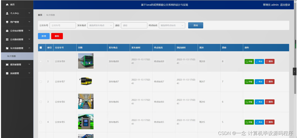 管理员点击车次信息管理。进入车次信息页面输入公交车次、途径、选择发车地点和选择终点站名可以查询、新增或删除车次详细信息,并进行详情,修改或删除操作。如图5-12所示: