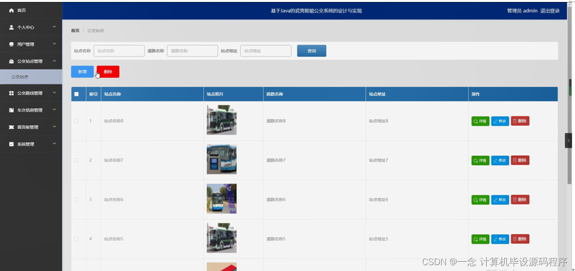 管理员点击公交站点管理。进入公交站点页面输入站点名称、道路名称和站点地址可以查询,新增或删除公交站点详细信息,并进行查看详情,修改和删除等操作。如图5-10所示: