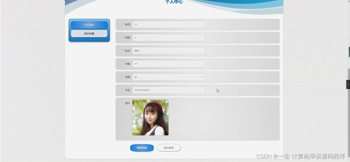 在个人中心页面输入个人信息可以进行更新操作,并在我的收藏页面对武夷智能公交信息进行收藏操作;如图5-6所示: