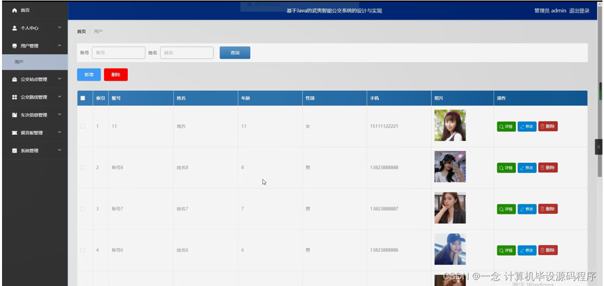 管理员点击用户管理。进入用户页面输入账号和姓名可以查询,新增或删除用户详细信息,并进行查看详情,修改或删除操作。如图5-9所示: