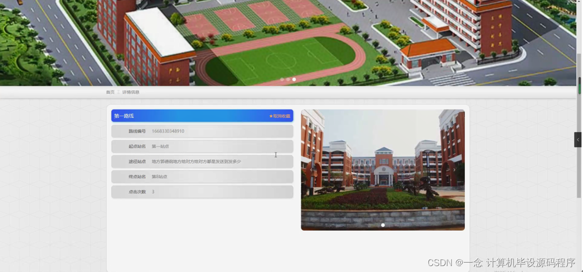 在公交站点页面的输入栏中输入站点名称、道路名称和站点地址进行查询,可以查看公交站点详细信息,并进行收藏操作;公交站点页面如图5-3所示: