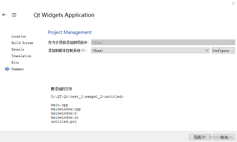 8、添加版本控制系统,如不使用,默认 None 即可,同时汇总了要创建的文件和路径,可以检查是否有误,点击完成。