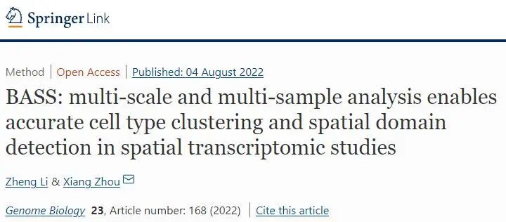 BASS:为单细胞分辨率的空间转录组学提供多尺度和多样本分析 BASS,支持单细胞分辨率空间转录组学的多尺度和多样本分析。BASS在单细胞尺度上进行细胞类型聚类,在组织区域尺度上进行空间结构域检测,这两项任务在贝叶斯层次结构模型框架内同时进行。